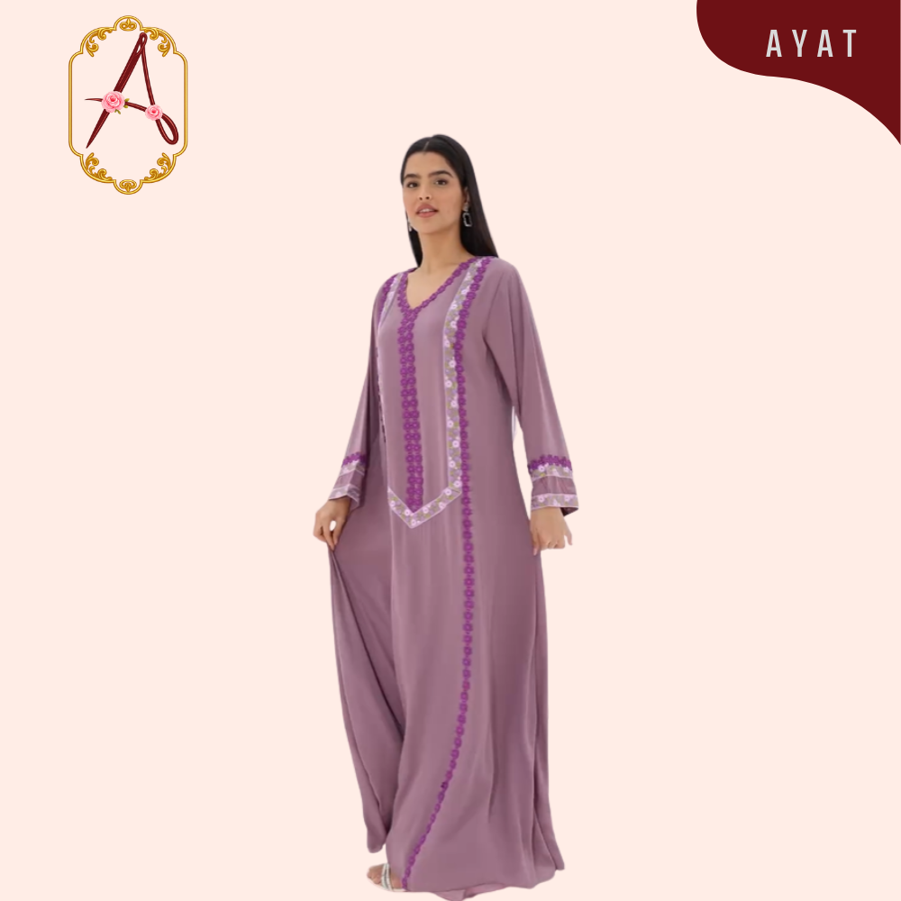 A beautifully designed premium kaftan dress featuring elegant lace embroidery and a flowy silhouette. Perfect for women who want comfort with a refined, stylish look for everyday wear or special occasions.