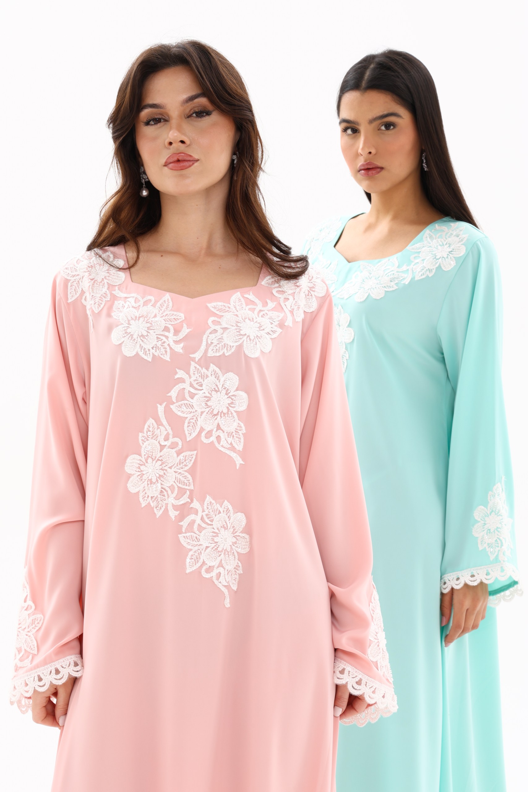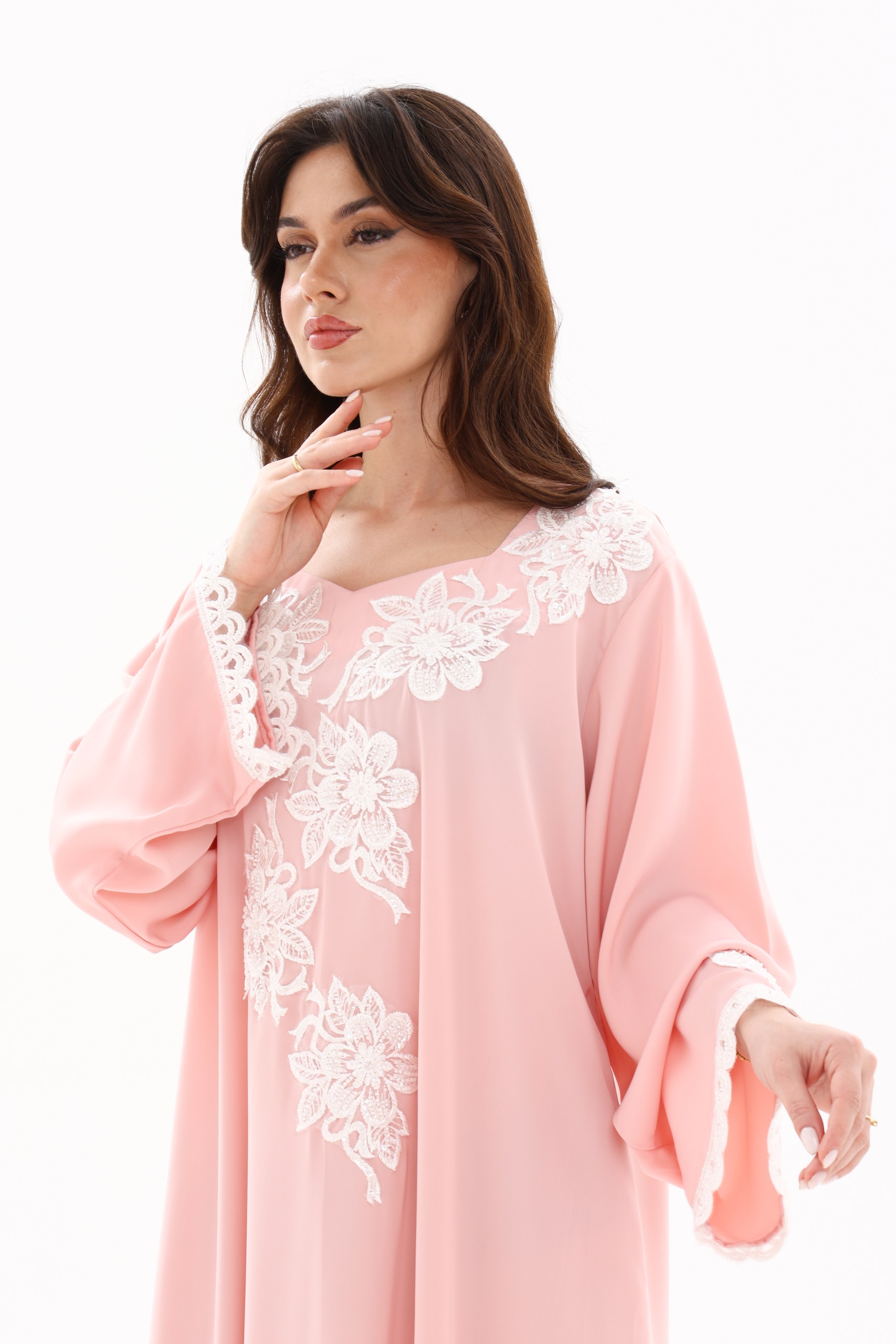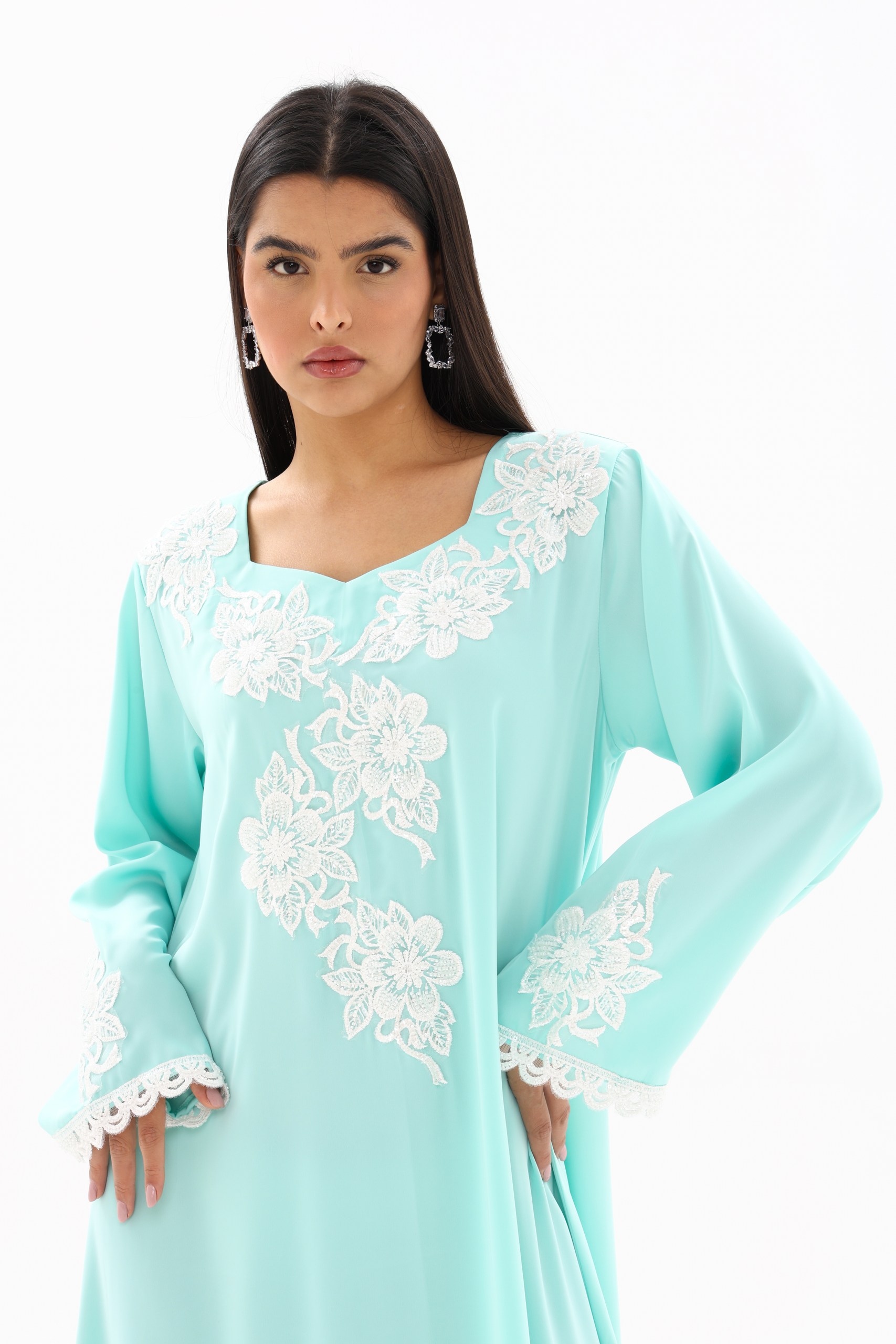 Featuring delicate floral embroidery across the neckline and front, this piece blends sophistication with a subtle feminine charm. The loose, flowing silhouette ensures maximum comfort while maintaining a graceful, flattering look for all body types.