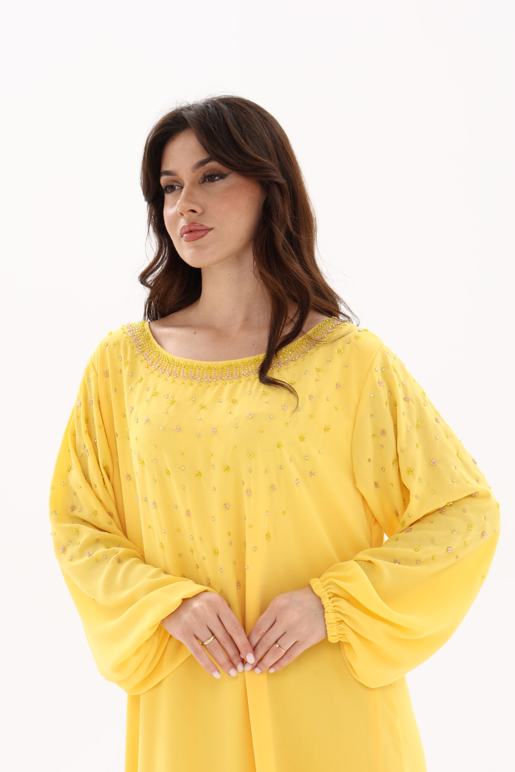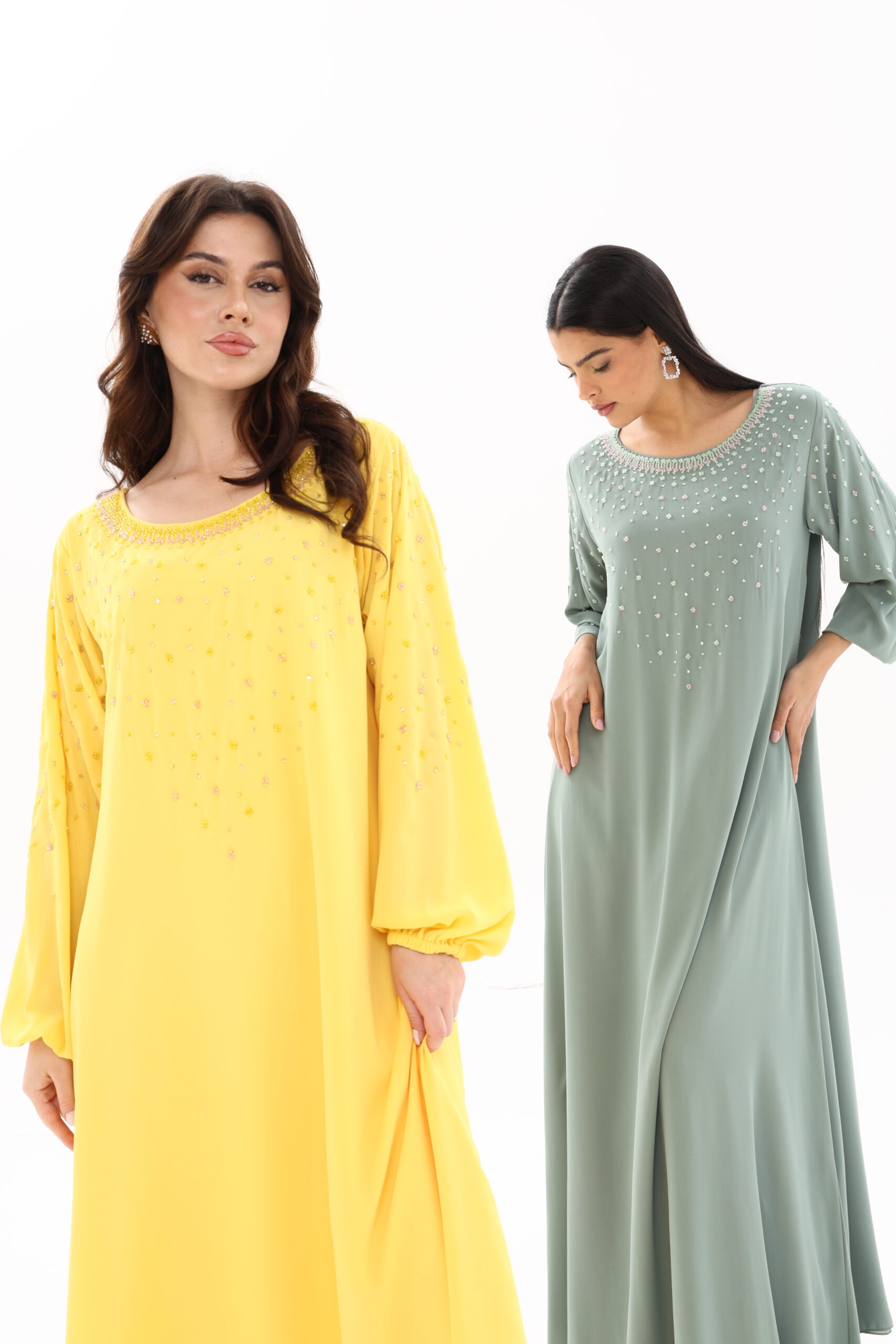Available in Sunshine Yellow for vibrant charm and Pastel Green for serene sophistication, this jalabiya reflects modern elegance with traditional inspiration.