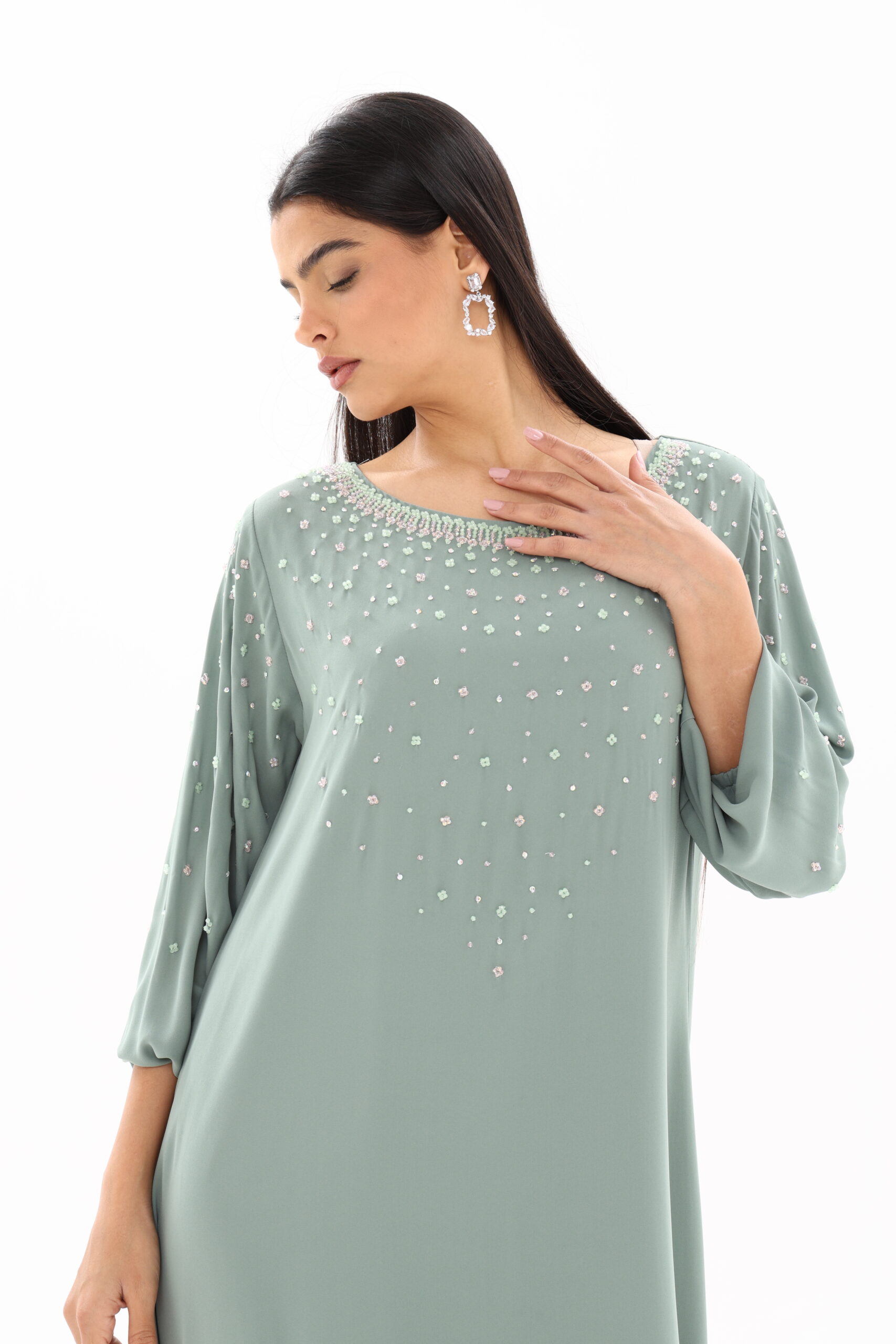 The Radiance Flow Embroidered Jalabiya is designed to stand out while maintaining elegance and sophistication. Its light flowing structure and subtle embroidery detailing create a graceful silhouette that enhances natural movement. Perfect for festive occasions and special events, this design brings a refined yet vibrant presence to your wardrobe.